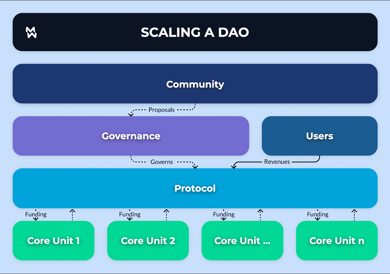 <figure><img src="https://1583485636-files.gitbook.io/~/files/v0/b/gitbook-x-prod.appspot.com/o/spaces%2FOGoMcCgzuGZjVkWo857x%2Fuploads%2FXcqcmvBGGGwEVcNbX44P%2FDAO%20Slide.png?alt=media&#x26;token=a890f550-fa7f-4b1e-9cae-2cd378d8a89f" alt=""><figcaption><p><em>Figure 8.  The interrelationships between protocols, users, core units, and communities.</em></p></figcaption></figure>